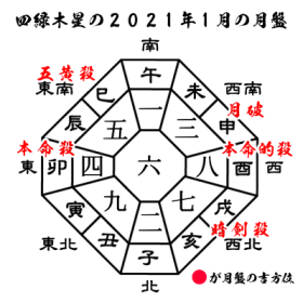 2021年11月の 四緑木星は、「東南」に回座しますので、この方角が本命殺となり月破も巡ります。