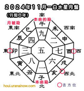 2024年11月の 一白水星は、「北」に廻座しますので、この方角が本命殺となります。その向かい側の九紫火星の巡る「南」は、本命的殺となります。これらはいずれも凶方位です。
